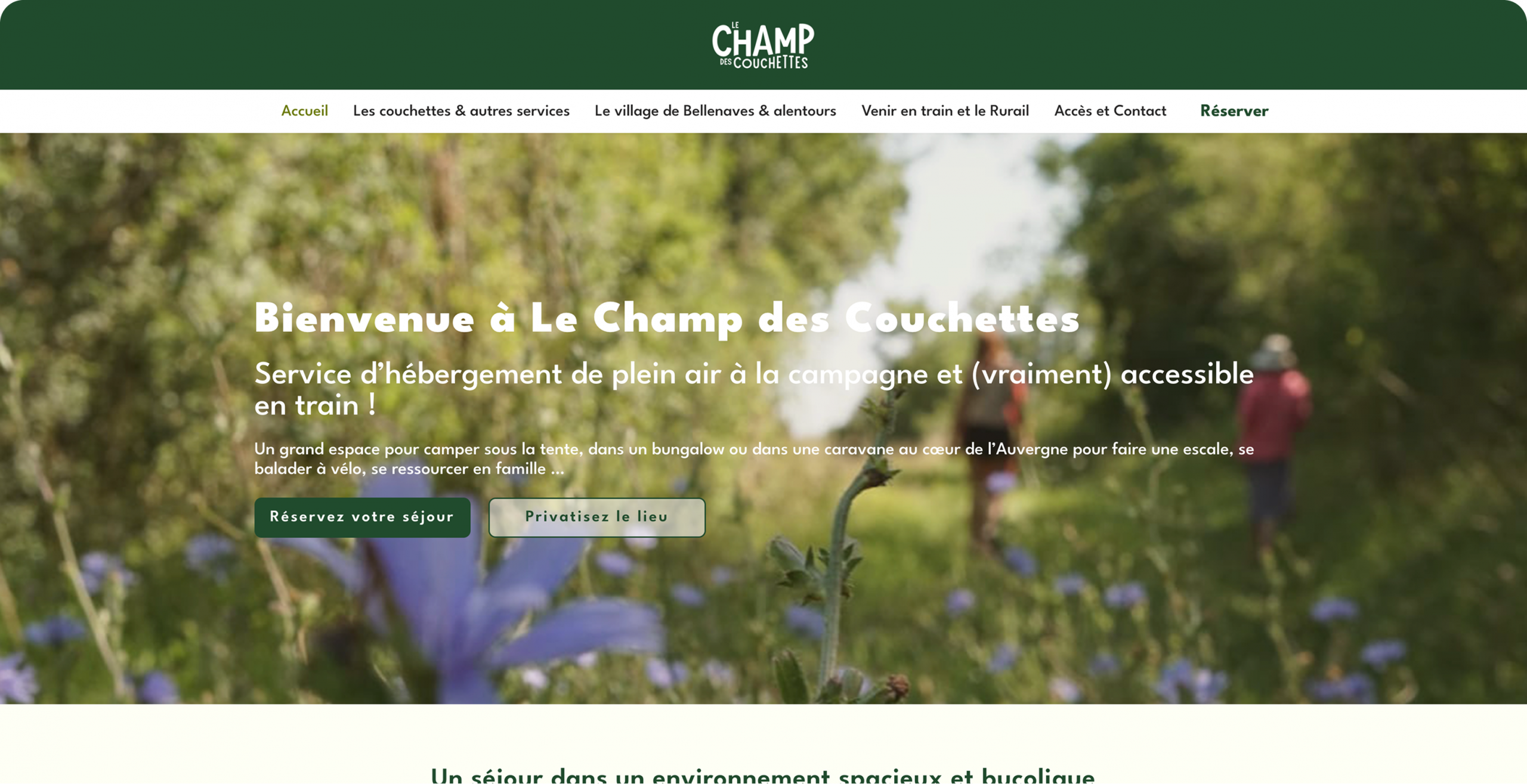 Le Champ des Couchettes est un hébergement en plein air situé dans l’Allier, avec une particularité rare : il est accessible en train. Dans un cadre budgétaire très restreint, l’enjeu était de créer un site vitrine désirable, fidèle à l’identité visuelle du projet et à l’esprit nature et slow travel de ses fondateurs.